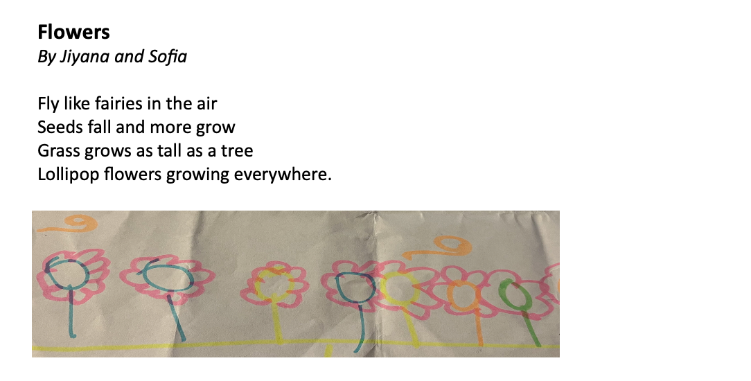 I was also given this bright and beautiful poem by Jiyana and Sofia. I love the ‘lollipop flowers’ imagery - delicious!