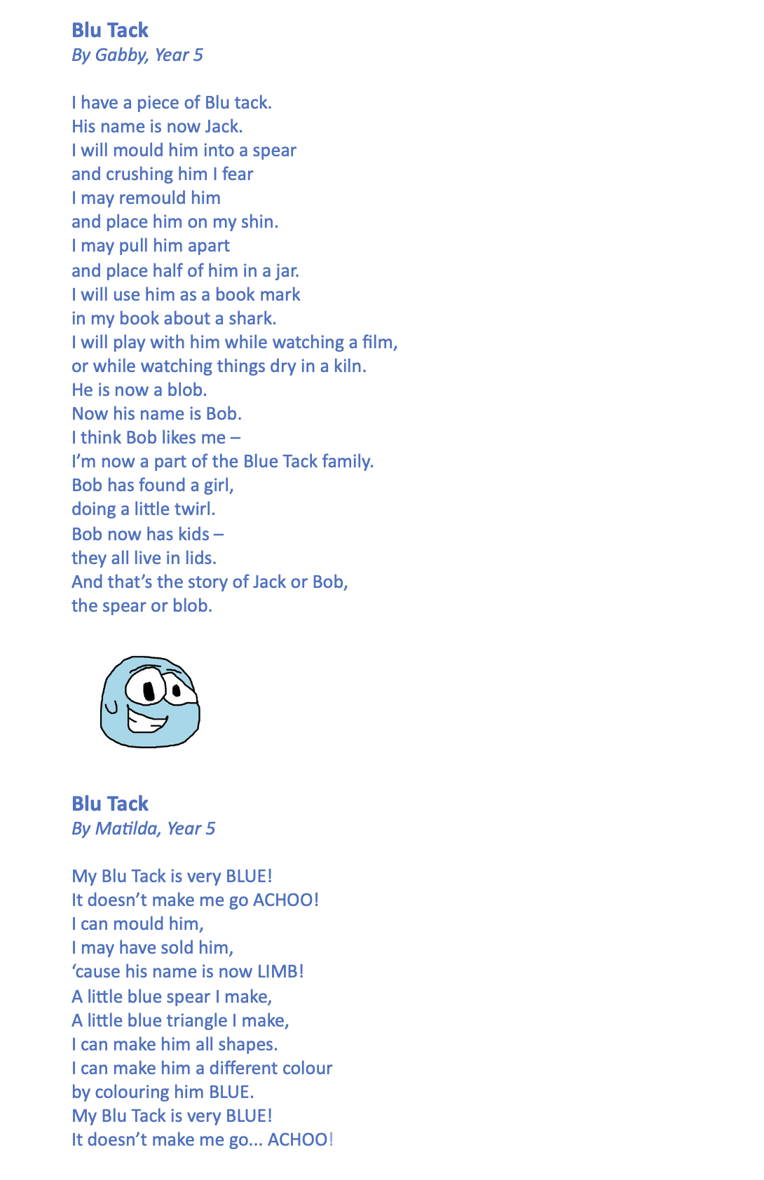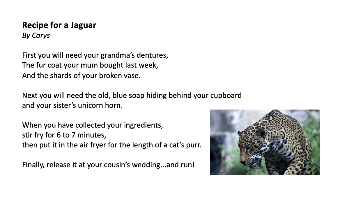 After performing my poem ‘Secret Weapon’ in assembly, it turned out that there were quite a few other blu tack fans, including Gabby and Matilda, who presented me with fantastic odes to the squidgy stuff! You can read ‘Secret Weapon’ in ‘Why Did My Brain Make Me Say It?’, and their poems are below, along with excellent recipe poems from Matilda and fellow budding-poet Carys. If you want your very own jaguar, you’ll be spoilt for choice!