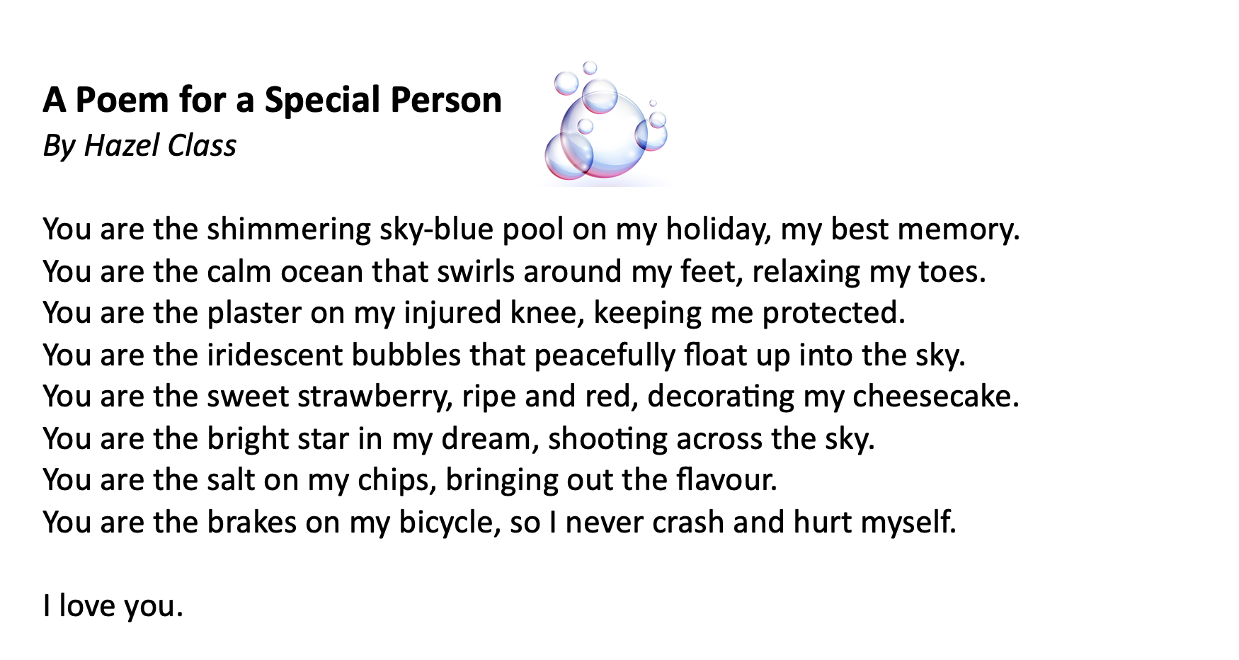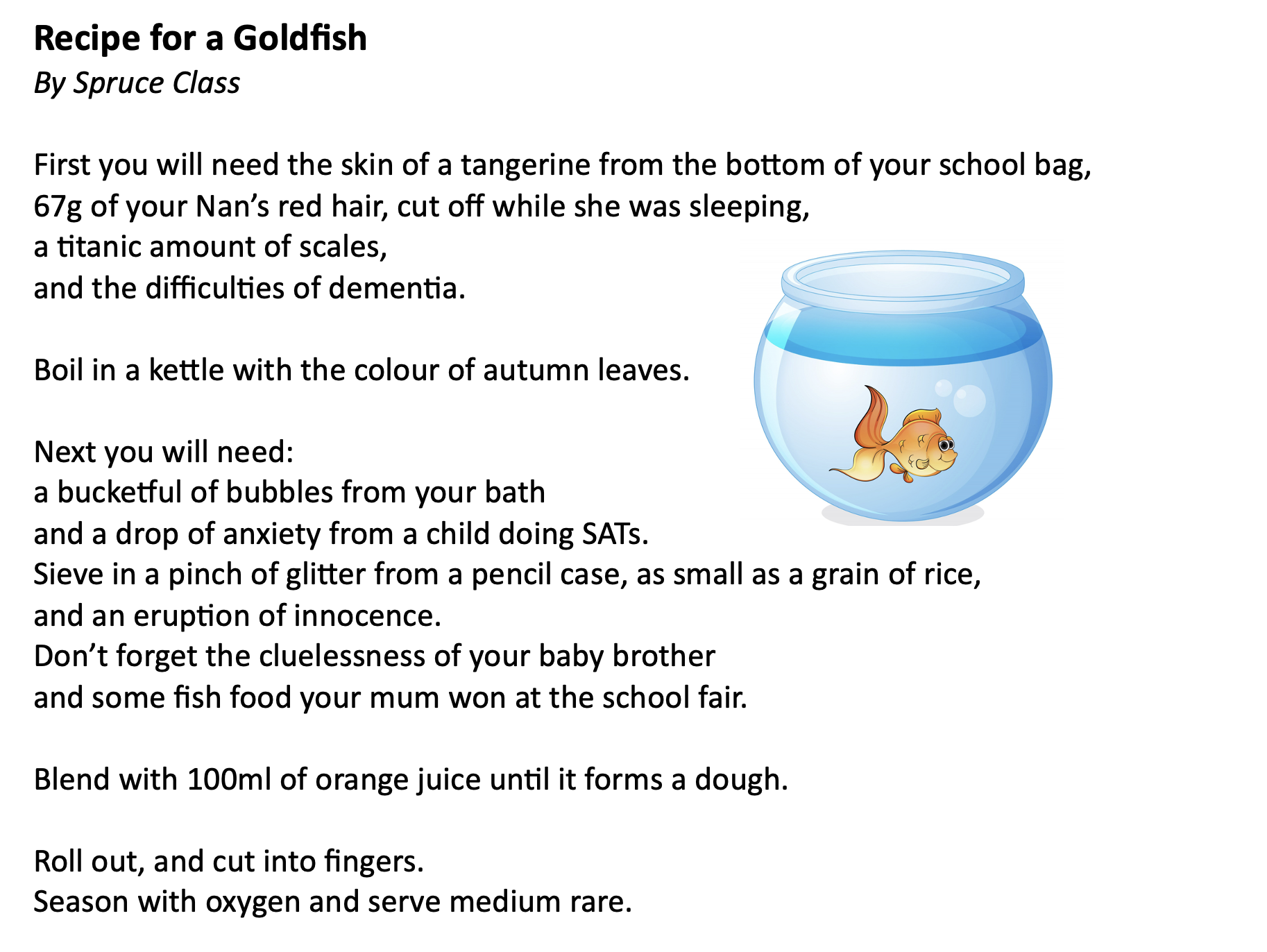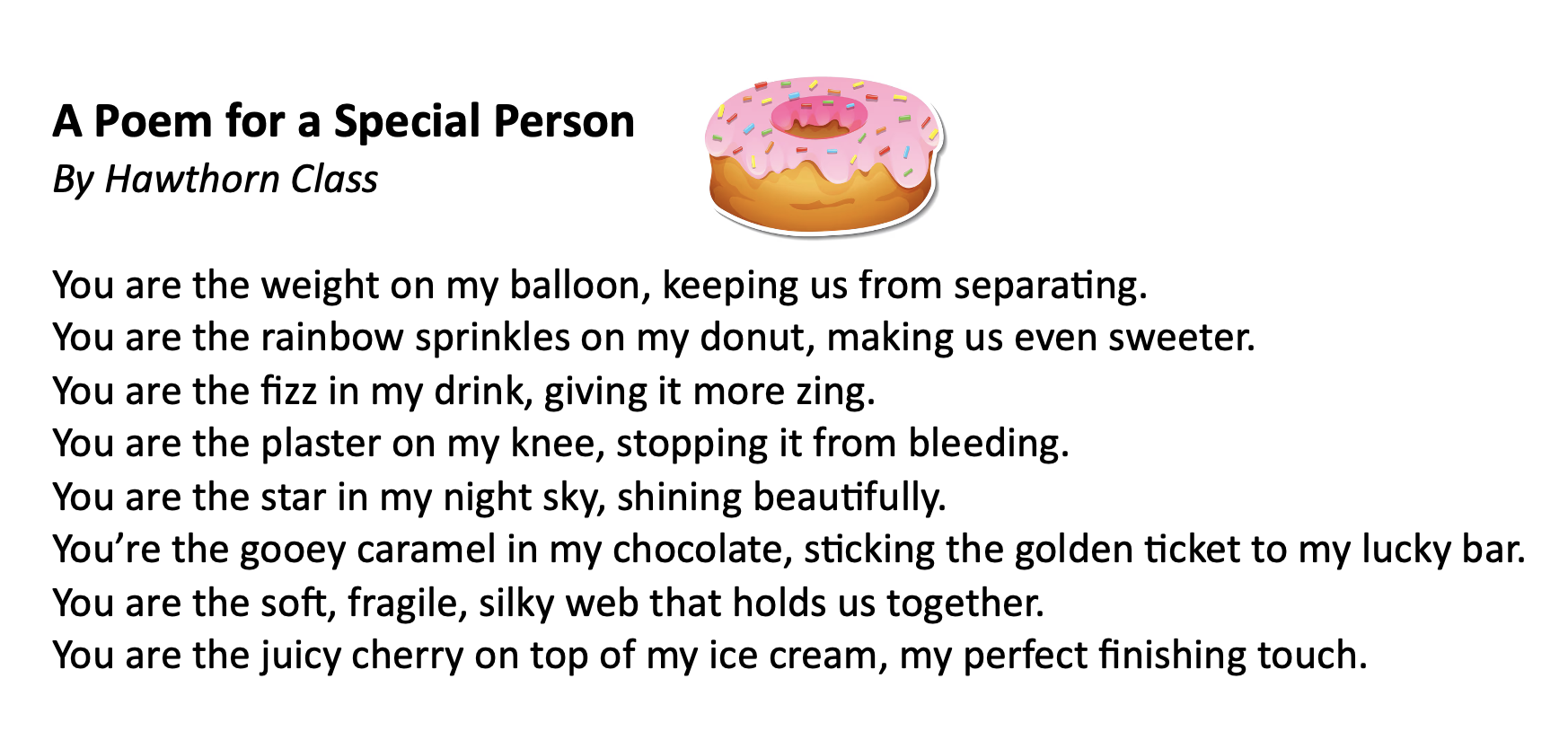 What a fun time I had at Commonswood Primary School and Nursery over two days. The excitement was palpable in assembly, not least when a teacher dressed as a dinosaur walked in! How could a poet compare to that? However, it turned out that Commonswood is chockablock with budding poets, from the best-listening nursery class ever, all the way up to year 6. Here are the wonderful poems for someone special written by years 3 and 4, and creative recipe poems from years 5 and 6.